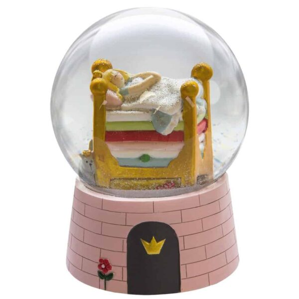 Snekugle pige Snekugle pige sød Kids by Friis snekugle med en bund i lyserød og med et fint mønster, så det ligner mursten. På fronten er der en lille brun dør med en guldkrone på. Inde i snekuglen ligger prinsessen på ærten i en guldseng med masser af ma
